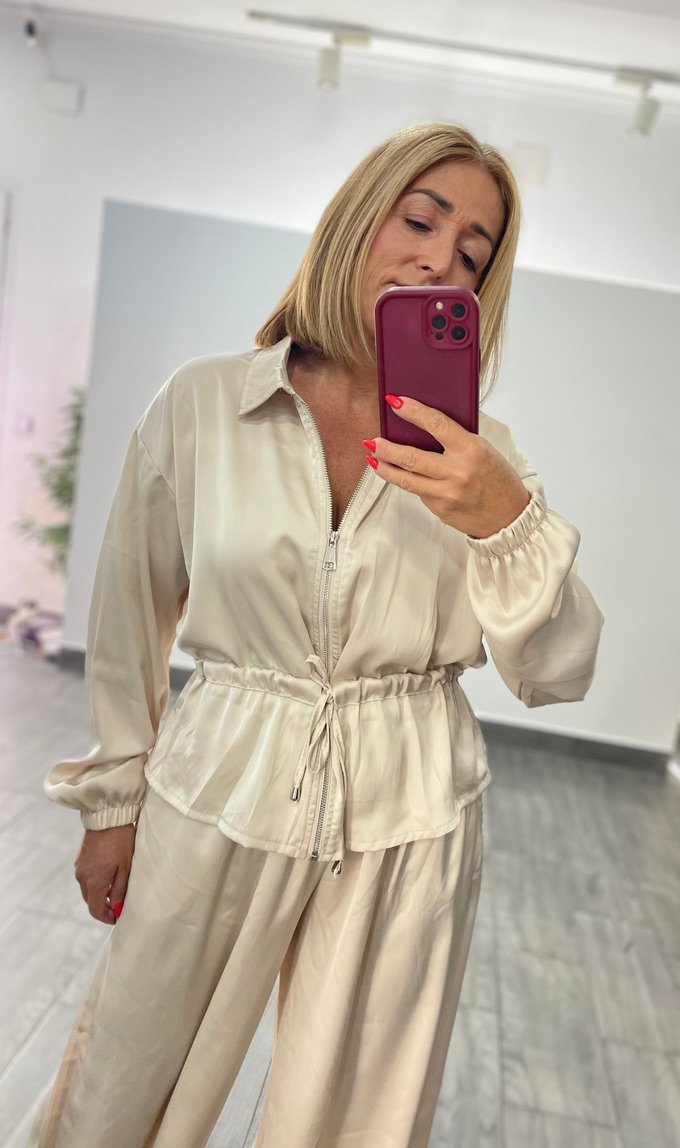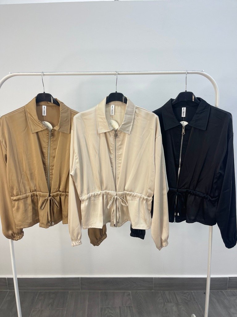 Chaqueta satinada con cremallera y cordon en cintura parab ajustar