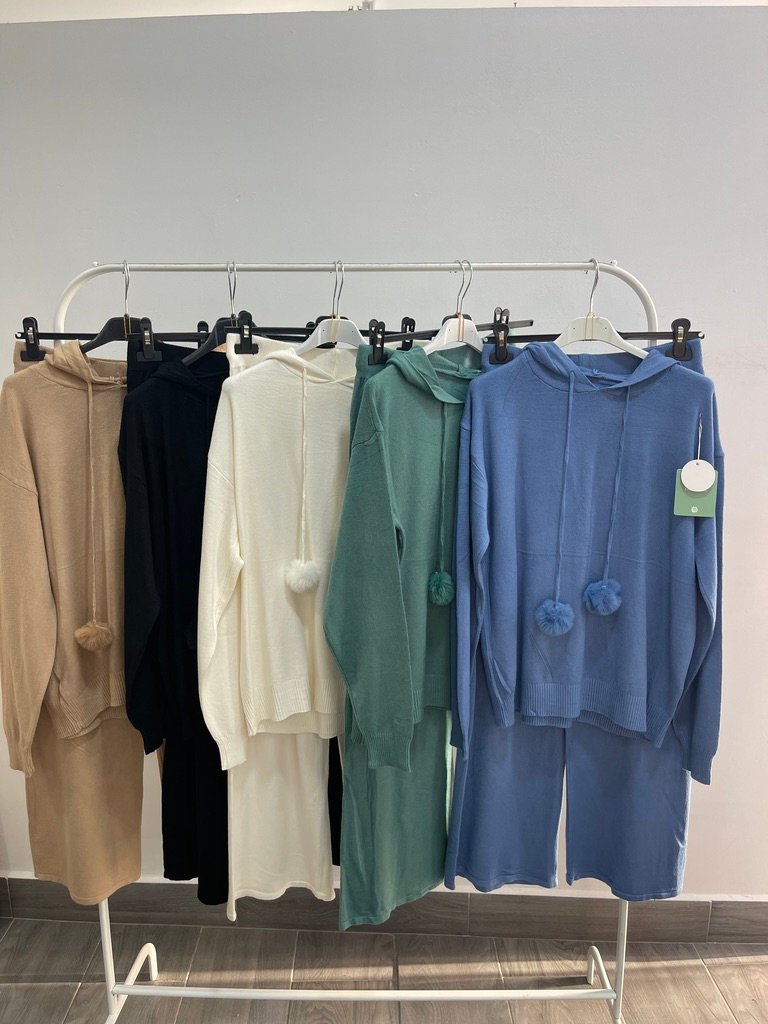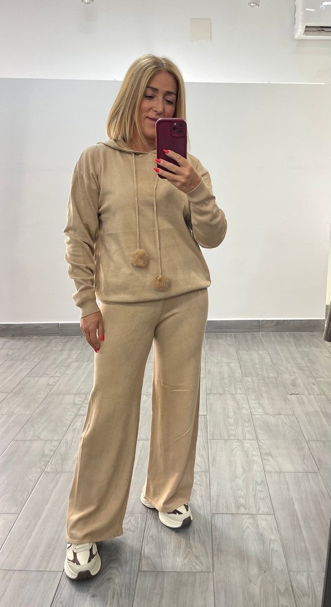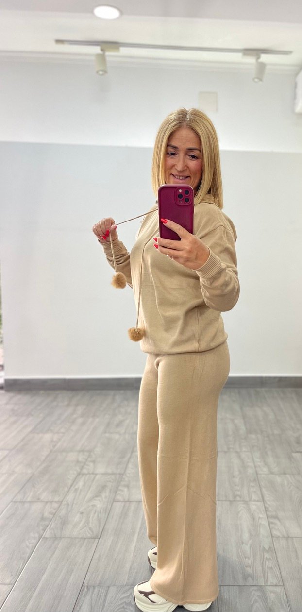 Conjunto de punto fino compuesto por jersey tipo sudadera con capucha y cordones terminado en pompon + pantalon wide leg cintura elastica
