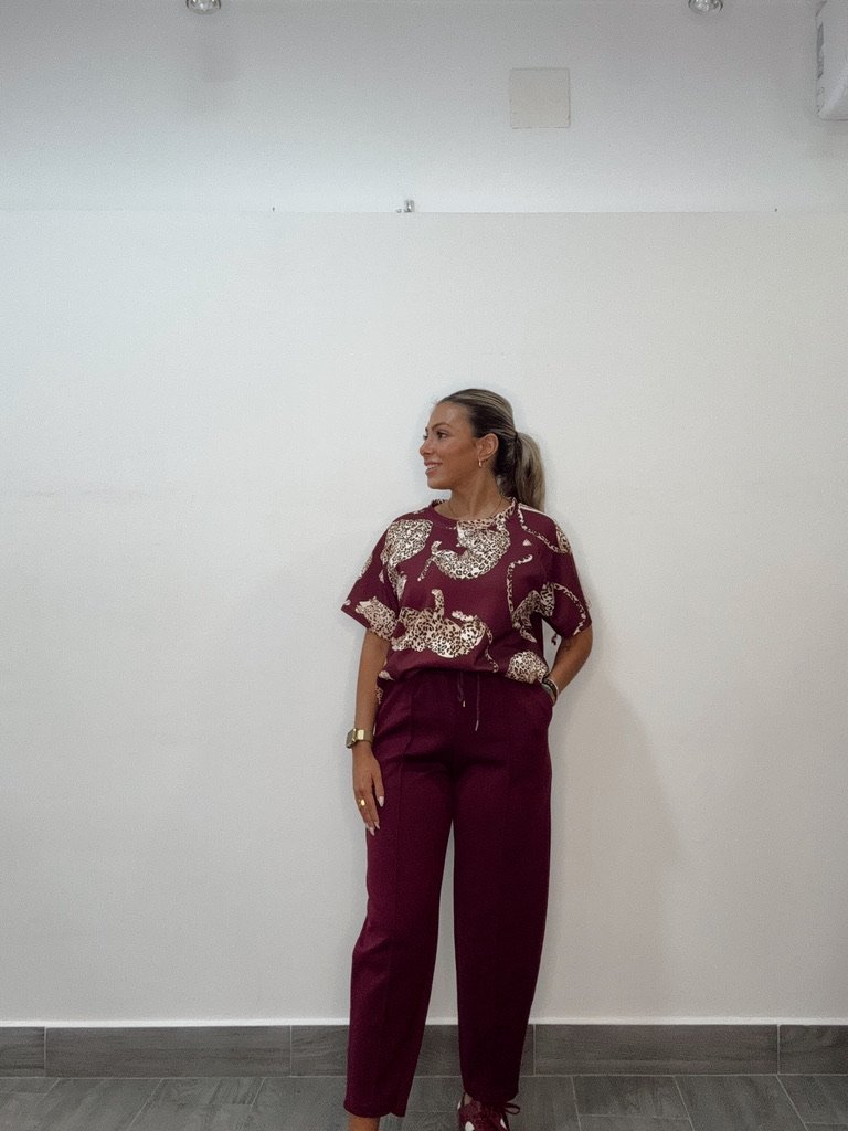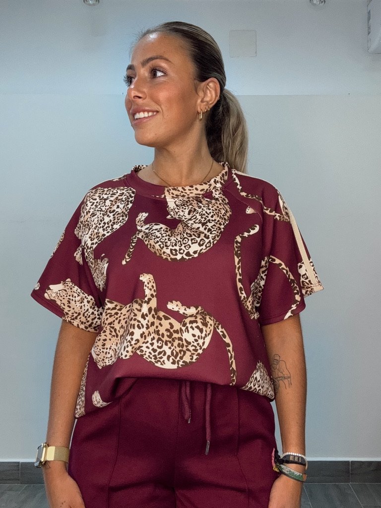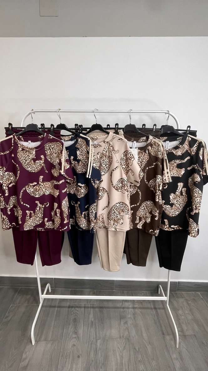 Conjunto capa de aire de dos piezas. Camiseta de manga corta estampado leopardo super original con detalles de rayas laterales en hombro y manga. Pantalon cintura elastica con cordon para ajustar y bolsillos, corte tipo mon y ademas de super tendencia son comodisimos
