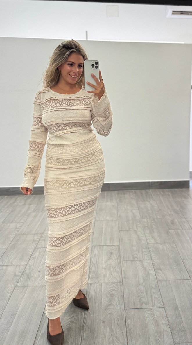 Falda midi en encaje elastico, con forro y raja lateral