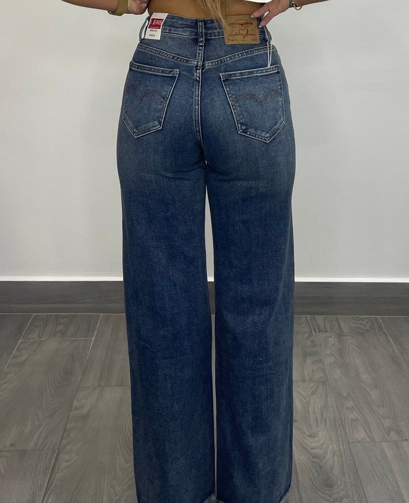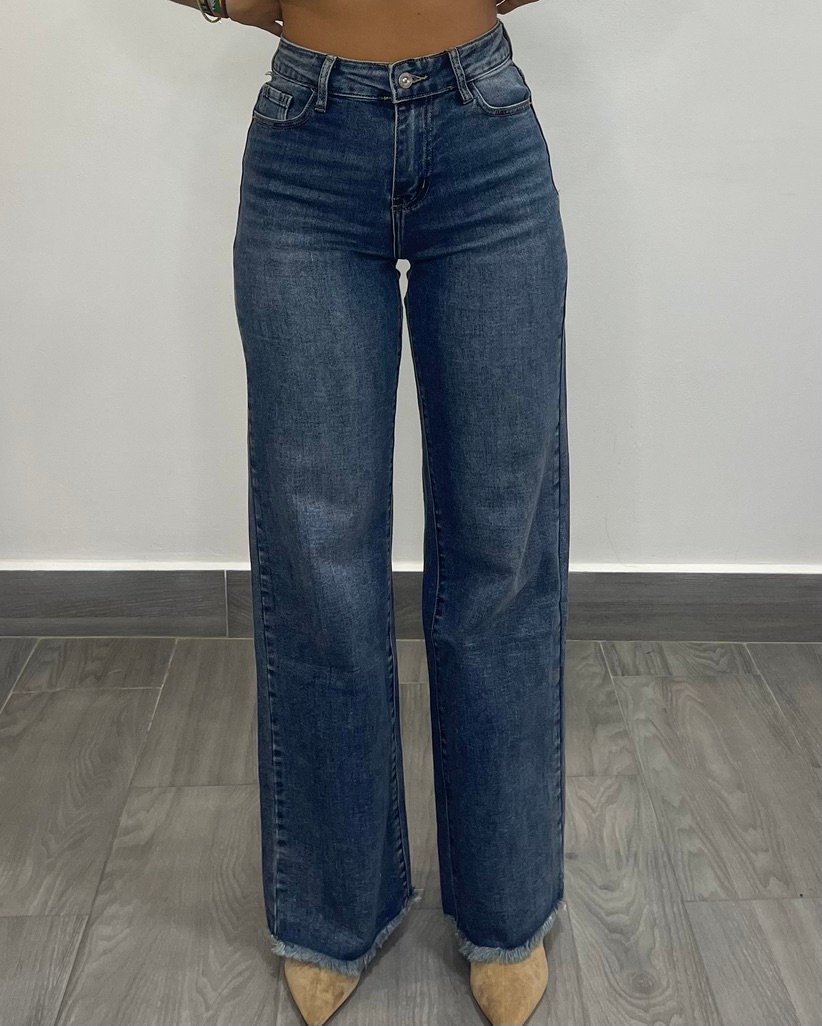 Pantalon tejido tejano con un poco de elastan en corte wide leg y bajos despuntados