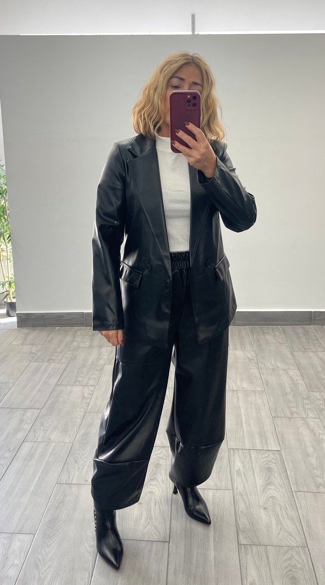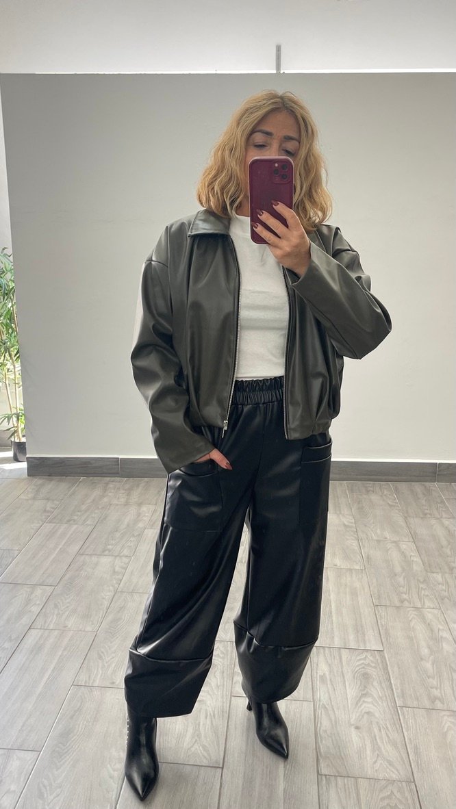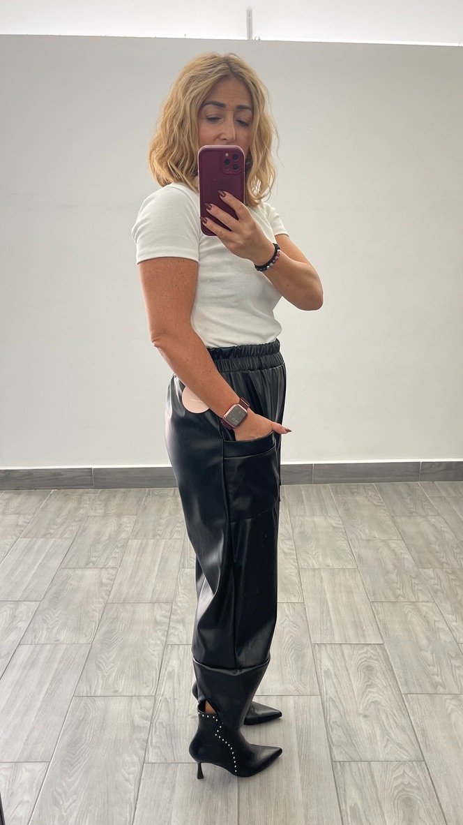 Pantalon globo polipiel con cinturilla elastica y bolsillos delanteros.