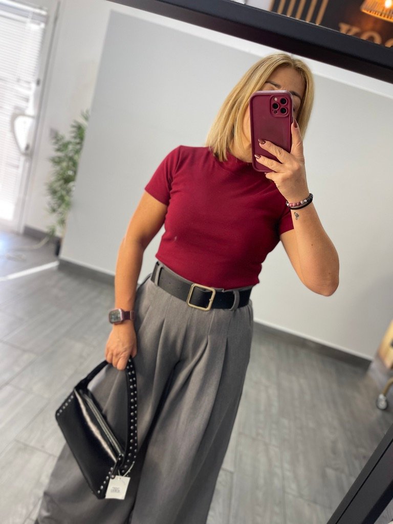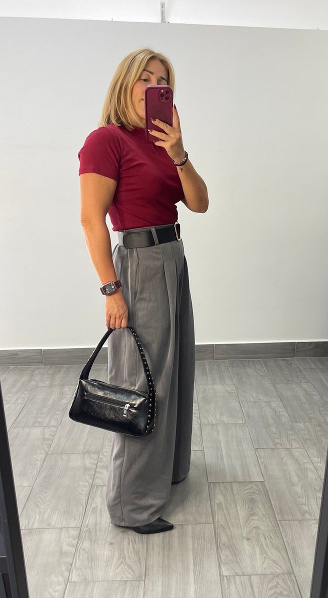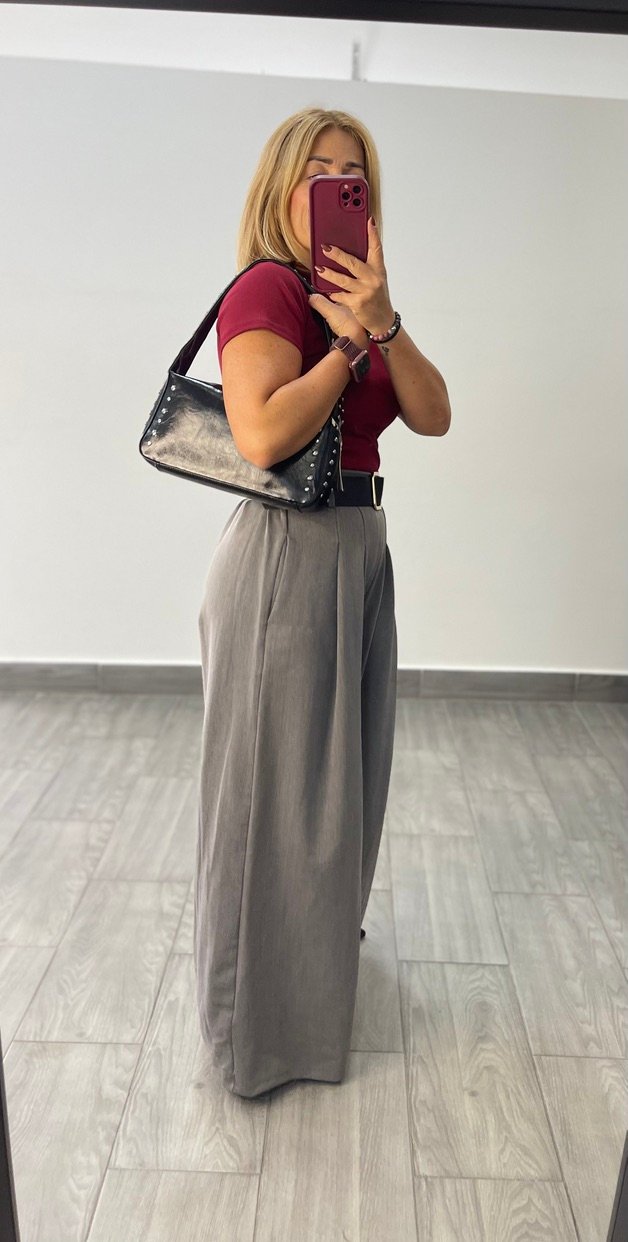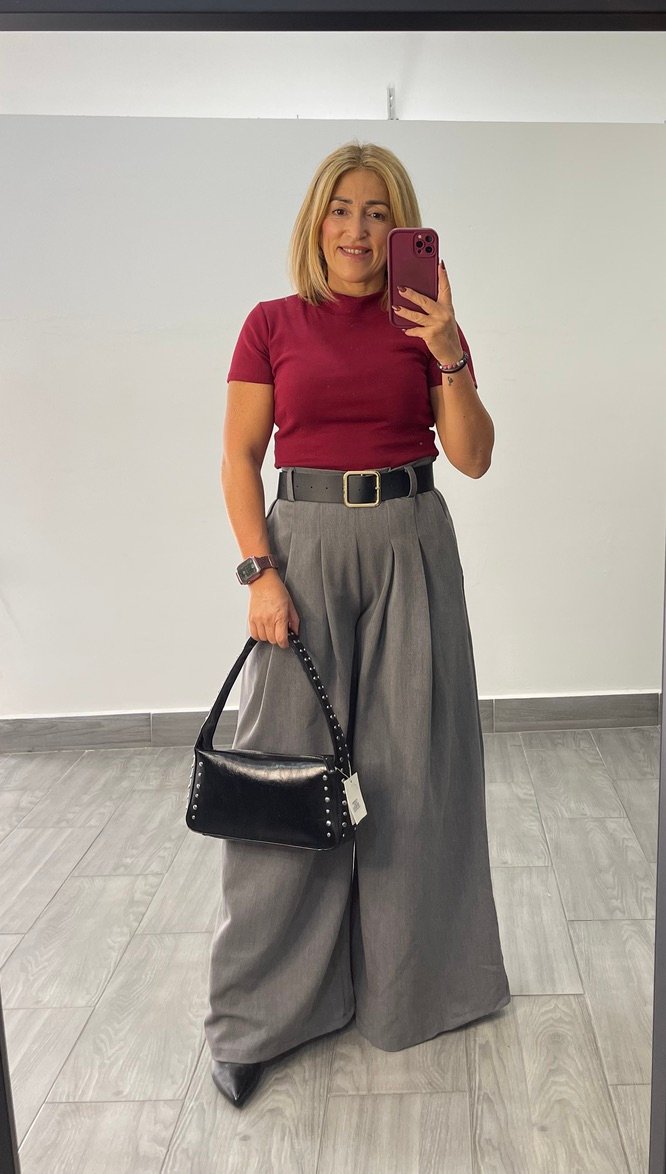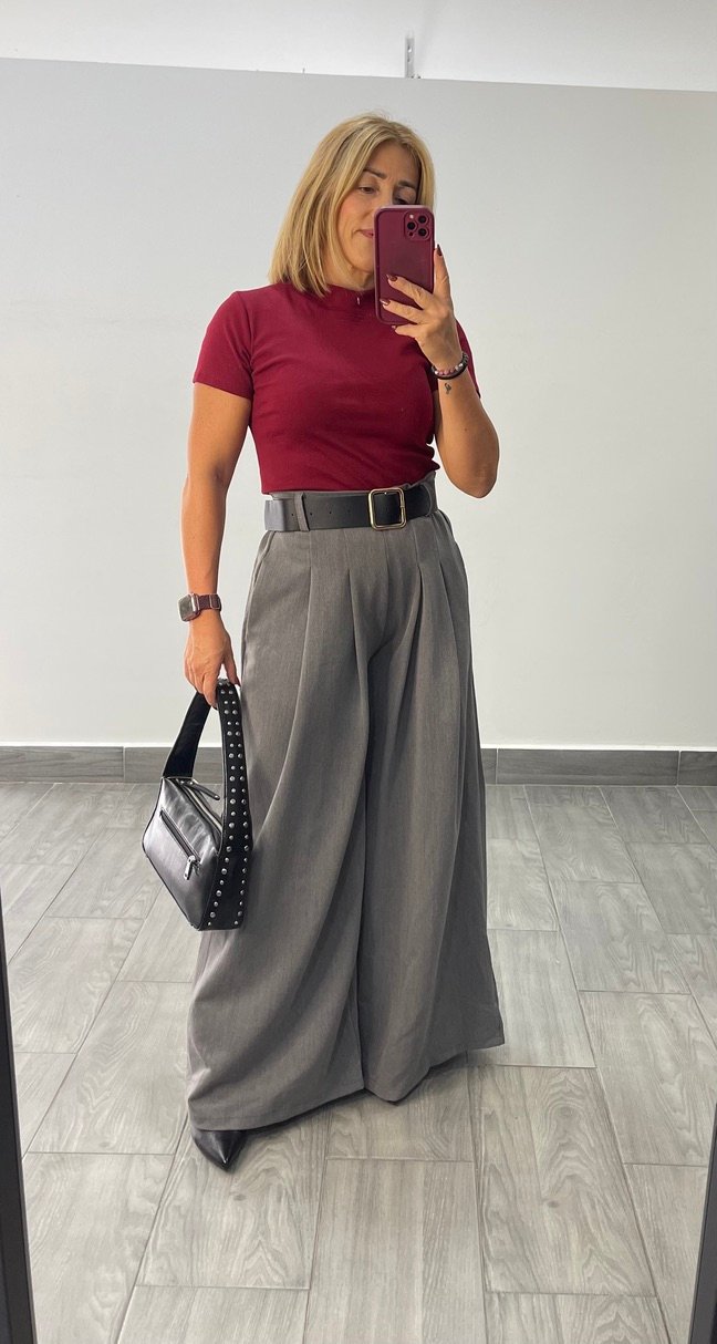 Pantalon pata elefante tejido vestir. Pinzas invertidas con bolsillo y cinturon incluido