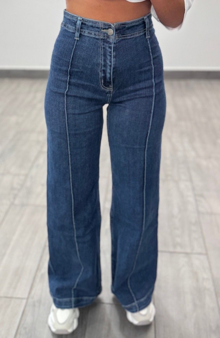 Pantalon. wide. leg largo con. pespunte delante. Tiro alto sin bolsillos delante y costuras para entallar zona cintura y. gluteo